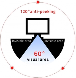 Dzięki zaawansowanej technologii mikrożaluzji zapewnia czytelność przy bezpośrednim spojrzeniu w zakresie 60 stopni, podczas gdy widok z boku jest całkowicie nieczytelny. Przy kącie 30 stopni obraz się przyciemnia, gwarantując maksymalną prywatność.