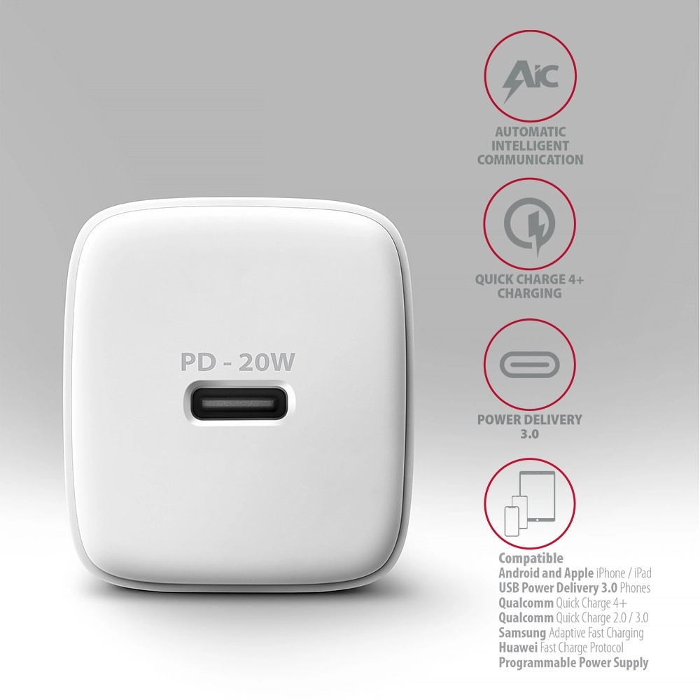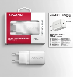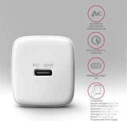Kompaktowa ładowarka sieciowa AXAGON ACU-PD20W do szybkiego ładowania urządzeń mobilnych. Dzięki łącznej mocy 20 W ładowarka potrafi ładować telefony, tablety i inne urządzenia mobilne z maksymalną możliwą prędkością. Adapter oferuje odwracalne złącze USB‑C.