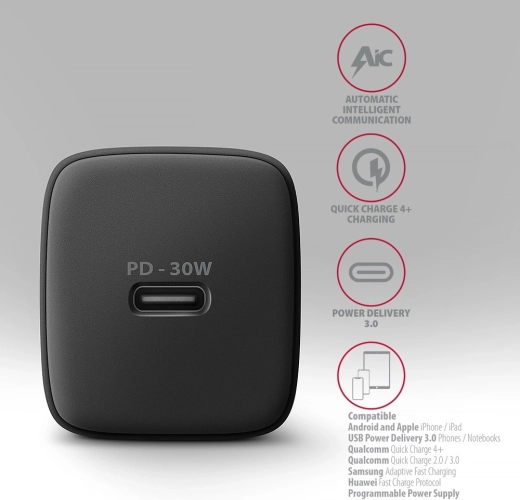 - Maksymalna moc 30 W – szybkie ładowanie PD/QC/PPS