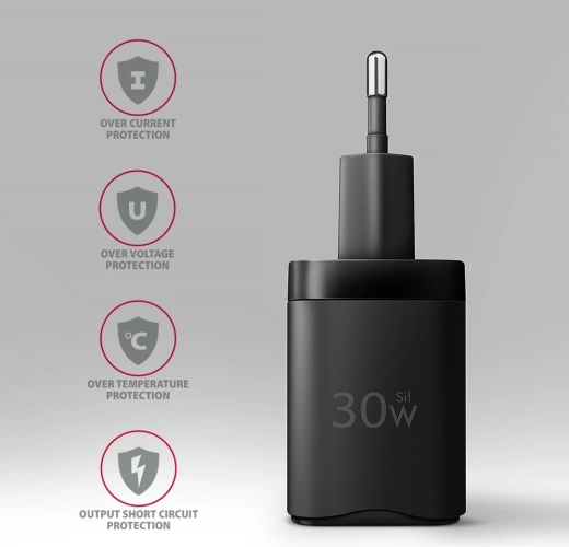 Ta lekka i kompaktowa ładowarka wykorzystuje nowoczesną technologię Si (Super Silicon) dla wyższej efektywności, mniejszych wymiarów oraz stabilnego i bezpiecznego ładowania. Pojedynczy port USB‑C zapewnia do 30 W, dzięki czemu niezawodnie obsłuży smartfony, tablety i wybrane ultrabooki.