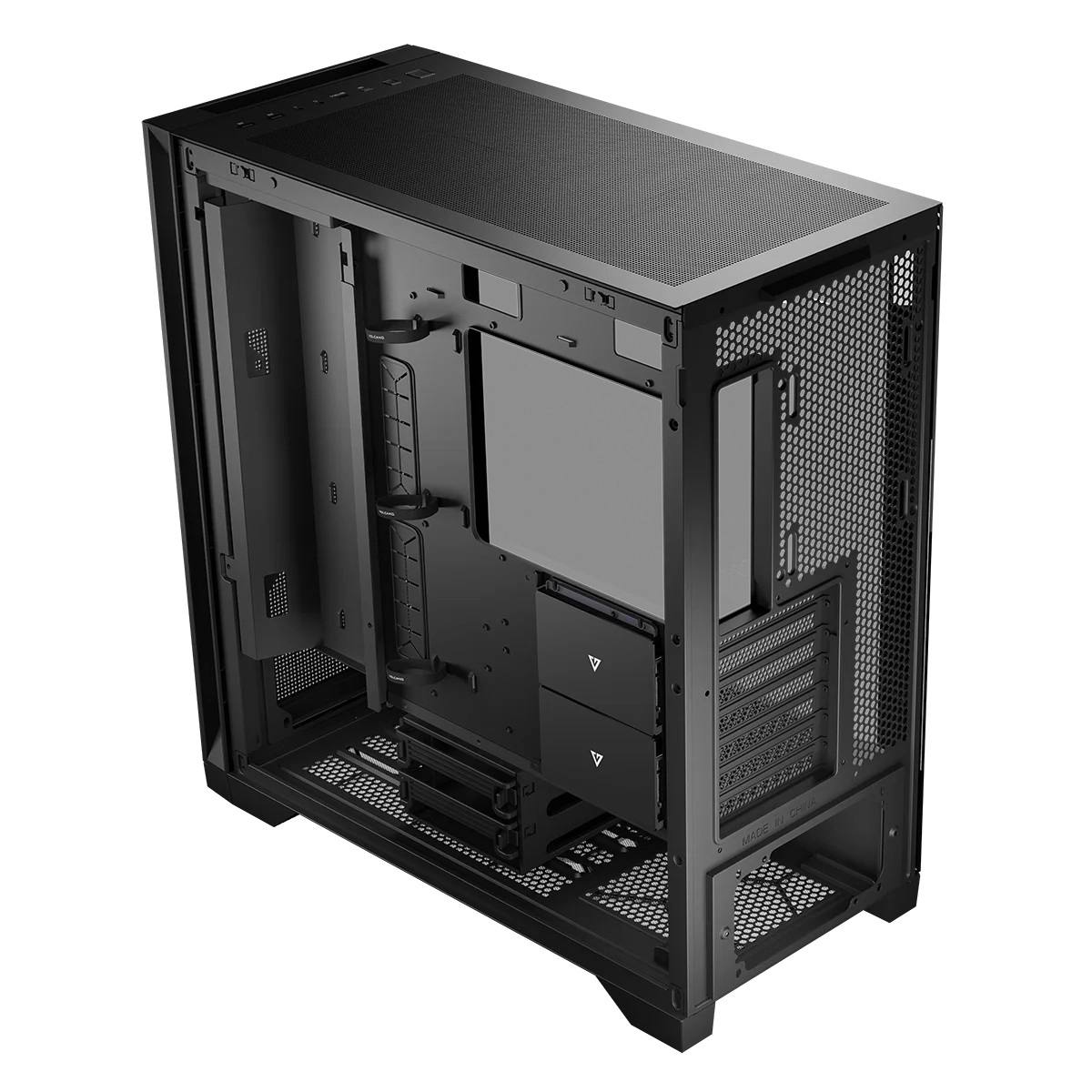 Szkielet Volcano Expanse S MIDI pozwala zorganizować wnętrze tak, by komputer był naprawdę „twój”! Na wysokości płyty głównej przewidziano miejsce na montaż korytka kablowego lub ramki wentylatorów. To od ciebie zależy, jak wykorzystasz tę możliwość aranżacji wnętrza. Zasobnik umożliwi uporządkowanie przewodów i utrzymanie ładu w środku obudowy. To idealne rozwiązanie dla osób, które lubią utrzymywać komputer w świetnej kondycji i cenią sobie estetykę. Jeśli składasz prawdziwego „gamingowego potwora” i potrzebujesz najlepszego chłodzenia, możesz zastąpić korytko ramką na trzy dodatkowe wentylatory 120 mm.