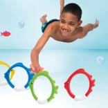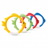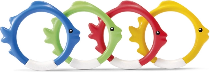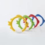 Zabawny zestaw czterech pierścieni do nurkowania w kształcie rybek dla dzieci od 6 lat. Pierścienie w kolorach niebieskim, czerwonym, zielonym i żółtym po wrzuceniu do wody stabilnie ustawiają się na dnie, co motywuje do treningu nurkowania i poprawia umiejętności pływackie. Wykonane z miękkiego i bezpiecznego materiału dla łatwego chwytu.