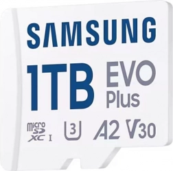 Rozszerz pamięć swojego telefonu, aparatu lub konsoli za pomocą karty microSD SAMSUNG EVO Plus 1 TB z prędkością odczytu do 160 MB/s, klasami U3, A2 i V30 dla płynnego wideo 4K oraz szybkiego działania aplikacji. Oferuje szeroką kompatybilność, odporność 6w1 na wodę, temperatury, promieniowanie rentgenowskie, magnesy, upadki i zużycie, a w zestawie znajduje się pełnowymiarowy adapter SD.