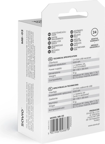 Bezprzewodowa mysz Savio MB-03 jest wyposażona w czujnik optyczny o rozdzielczości 1000 DPI, który zapewnia płynne i precyzyjne ruchy kursora. Dzięki połączeniu bezprzewodowemu 2,4 GHz z odbiornikiem USB oferuje pełną swobodę ruchu bez zbędnych kabli. Technologia Plug & Play umożliwia szybkie podłączenie bez konieczności instalacji sterowników – wystarczy włożyć odbiornik USB, a mysz od razu działa.