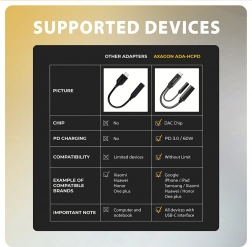 Zewnętrzna karta dźwiękowa ADA-HCPD to nie tylko świetne rozwiązanie dla urządzeń bez gniazda audio, ale dzięki Power Delivery 3.0 o mocy do 60 W umożliwia jednoczesne ładowanie smartfona lub laptopa, co eliminuje konieczność ciągłego odłączania słuchawek. Ciesz się doskonałym brzmieniem podczas słuchania muzyki, oglądania filmów lub grania. Adapter obsługuje bezstratne formaty, takie jak FLAC, WMA, WAV, APE, AAC czy ALAC, i jest kompatybilny z platformami takimi jak Spotify, Apple Music i inne.