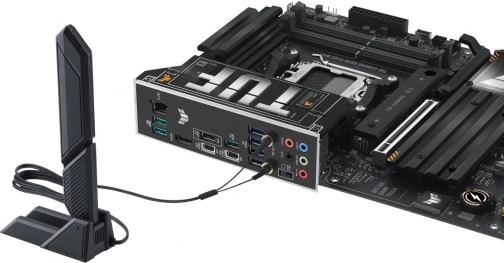 Tylny panel I/O oferuje liczne porty USB, wyjścia wideo, 2.5G LAN oraz łączność bezprzewodową z zewnętrzną anteną dla stabilnej pracy sieci.