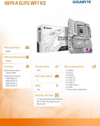 AORUS X870 A ELITE ICE to nowoczesna płyta ATX dla procesorów AMD Ryzen 9000/8000/7000 z gniazdem AM5. Potężne zasilanie 16+2+2 faz i zaawansowane chłodzenie VRM Thermal Armor Advanced zapewniają stabilność przy wysokim obciążeniu i podkręcaniu. Obsługa Dual Channel DDR5 z profilami AMD EXPO oferuje maksymalną przepustowość pamięci.