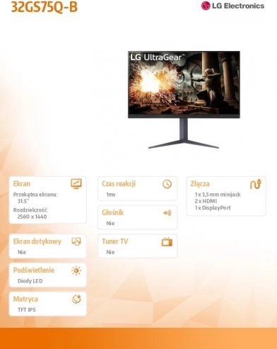 LG UltraGear 32GS75Q-B to monitor gamingowy, który łączy szybkość z wysoką jakością obrazu. Panel QHD (2560 × 1440) zapewnia ostre detale, a wysoka częstotliwość odświeżania 180 Hz i czas reakcji 1 ms minimalizują rozmycia i rwanie obrazu, gwarantując idealną płynność. To świetny wybór do rozgrywek konkurencyjnych, ale też wymagającej pracy z grafiką.