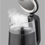 Obudowa czajnika jest wykonana z plastiku, natomiast wnętrze z wysokiej jakości szkła borokrzemowego, co zapewnia trwałość i łatwe czyszczenie.