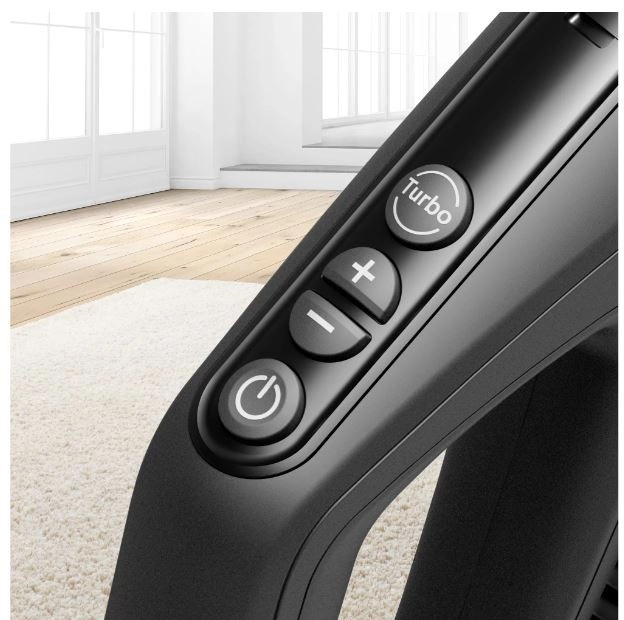 Nie musisz się schylać, aby ustawić moc ssania. Zdalne sterowanie mocą pozwala kontrolować wszystkie ustawienia bezpośrednio z uchwytu. Jednym dotknięciem możesz przełączyć na tryb turbo, tryb czuwania lub wybrany poziom mocy. Teraz możesz korzystać z maksymalnej wydajności odkurzania na wszystkich typach podłóg.