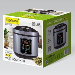 Multicooker MAESTRO MR-794 o pojemności 5 litrów i mocy 900 W to uniwersalny pomocnik do gotowania, smażenia i pieczenia. Oferuje 30 programów, sterowanie dotykowe, opóźniony start oraz podtrzymywanie temperatury do 24 godzin. Wytrzymała konstrukcja ze stali nierdzewnej i tworzywa, nieprzywierająca misa oraz automatyczne czyszczenie gwarantują wygodę i łatwą konserwację.