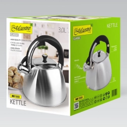Czajnik Maestro posiada nienagrzewającą się rączkę dla wygody i bezpieczeństwa podczas obsługi. Praktyczny gwizdek informuje o osiągnięciu wrzenia. Zdejmowana pokrywa ułatwia nalewanie wody i czyszczenie.