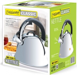 Czajnik Maestro 2,2 l łączy nowoczesny design z praktycznymi funkcjami. Wykonany ze stali nierdzewnej i plastiku, wyróżnia się trwałością i eleganckim wyglądem. Nienagrzewająca się rączka zapewnia bezpieczeństwo podczas użytkowania, eliminując ryzyko oparzeń. Gwizdek informuje, gdy woda się zagotuje, co jest praktycznym i bezpiecznym rozwiązaniem do codziennego użytku.
