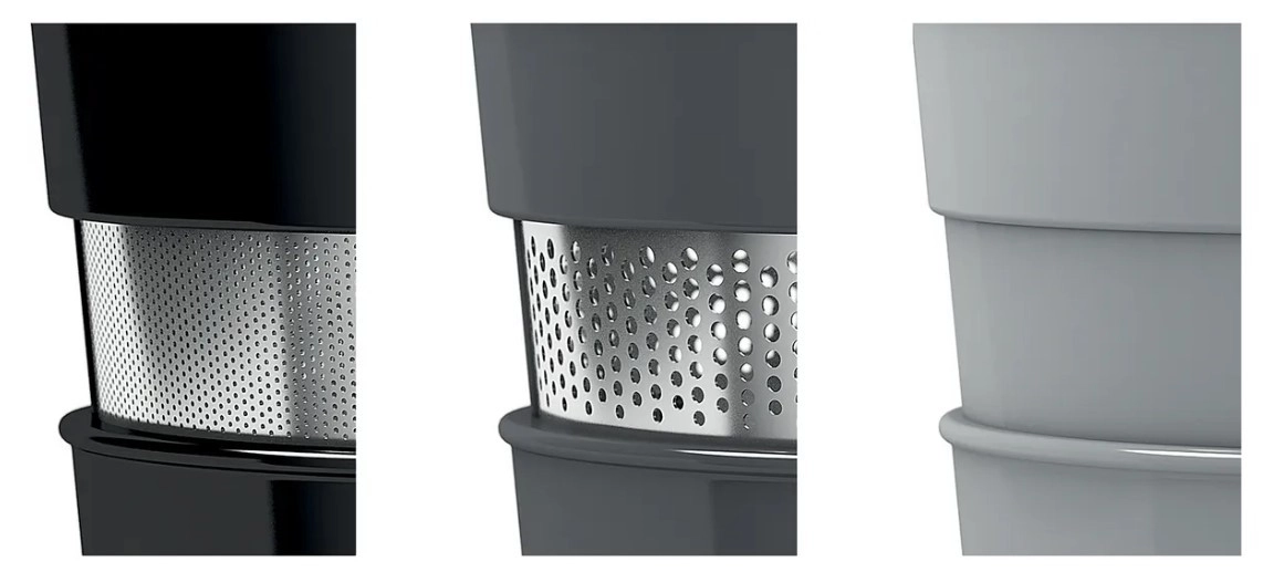 Przemyślane detale, takie jak DripStop dla czystego blatu, plastikowe części bez BPA dla bezpiecznego kontaktu z żywnością oraz możliwość mycia w zmywarce, oszczędzają czas i kłopoty. Cichy silnik 150 W z prędkością około 55 obr./min zapewnia wysoką wydajność przy minimalnym hałasie.