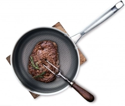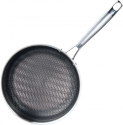 Solidna patelnia ze stali nierdzewnej o średnicy 26 cm została zaprojektowana dla precyzyjnych rezultatów i długiej żywotności. Trójwarstwowe, kanapkowe dno łączy zewnętrzną magnetyczną stal nierdzewną 430, aluminiowy rdzeń dla perfekcyjnego przewodzenia ciepła oraz wewnętrzną stal nierdzewną 304 do kontaktu z żywnością. Teksturowana powierzchnia z heksagonalnym wzorem „plastra miodu” zwiększa odporność na zarysowania i wspomaga nieprzywieranie.