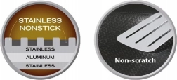 Magnetyczna stal nierdzewna 430 w warstwie zewnętrznej umożliwia użycie na gazie, elektryce, płycie ceramicznej i indukcji. Patelnia nadaje się również do zmywarki.
