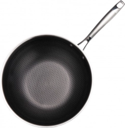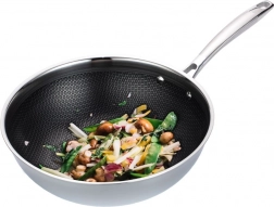 Solidny wok MAESTRO o średnicy 30 cm z trójwarstwowym korpusem ze stali nierdzewnej i aluminiowego rdzenia zapewnia szybkie i równomierne rozprowadzanie ciepła, odporność na zarysowania oraz nieprzywierającą powłokę o strukturze plastra miodu. Odpowiedni do wszystkich typów kuchenek, w tym indukcji, z wygodną nierdzewną rączką, która się nie przegrzewa, oraz możliwością mycia w zmywarce.