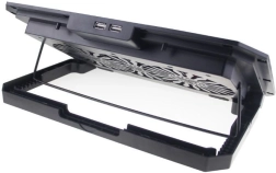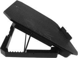 Podstawka chłodząca jest przeznaczona dla laptopów do 17" i łączy skuteczne chłodzenie z komfortem pracy. Dwa duże wentylatory 140 mm o prędkości do 1300 obr./min zapewniają płynny przepływ powietrza przez metalową siatkę, a widoczne podświetlenie LED dodaje stanowisku pracy stylu.