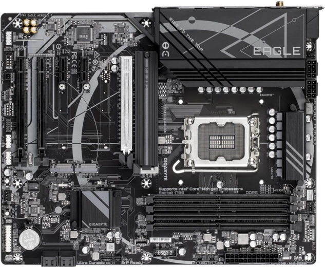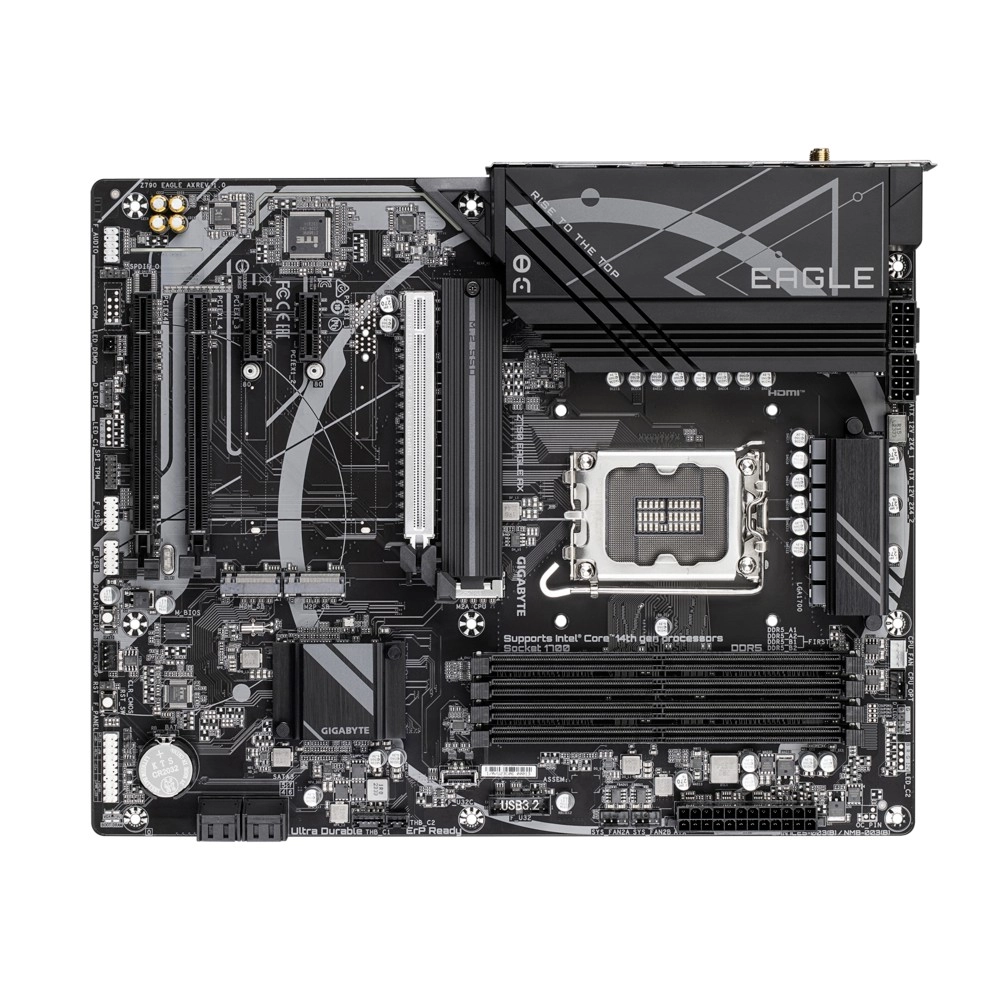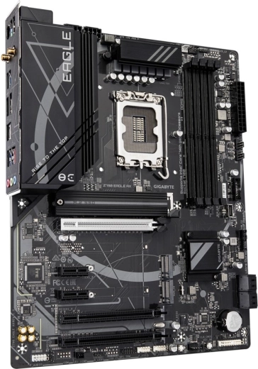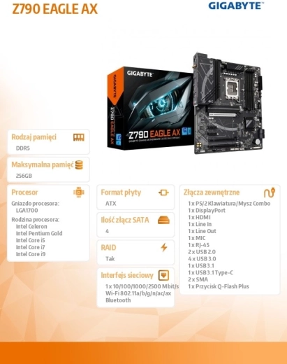 Wydajna płyta główna GIGABYTE Z790 EAGLE AX dla procesorów Intel Core 12./13./14. generacji oferuje stabilne zasilanie z 12+1+1‑fazowym cyfrowym VRM, szybką pamięć DDR5 (XMP 3.0), potrójne gniazda M.2 PCIe 4.0, nowoczesną łączność 2.5GbE LAN i Wi‑Fi 6E, a także praktyczne funkcje jak EZ-Latch i Q-Flash Plus.