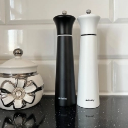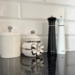 Dzięki przemyślanej konstrukcji młynki wygodnie się napełnia poprzez odkręcenie górnego pokrętła i górnej części. Matowa powierzchnia w kolorach czarnym i białym pasuje do każdej kuchni i jest łatwa w utrzymaniu – wystarczy przetrzeć suchą ściereczką. Świetny pomysł na stylowy prezent dla miłośników gotowania.