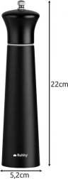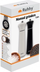 Elegancki zestaw dwóch ręcznych młynków RUHHY w kolorze czarnym i białym do świeżo mielonej soli i pieprzu. Oferuje ceramiczny mechanizm mielący, płynną regulację grubości mielenia oraz ergonomiczny kształt dla wygodnego użytkowania. Dzięki wysokiej jakości materiałom i nowoczesnemu wzornictwu młynki są trwałe, precyzyjne i łatwe w czyszczeniu.