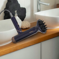 Koncentrator precyzyjnie kieruje strumień powietrza dla gładkiego modelowania i grzywki. Dyfuzor równomiernie rozprasza powietrze, wspiera naturalne fale i objętość bez puszenia.
