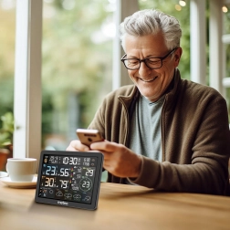 Sofistykowany design uzupełnia wyświetlacz LCD i zewnętrzny sensor, umożliwiający pomiar do 60 metrów. Ta stacja meteorologiczna jest doskonała dla gospodarstw domowych chcących mieć wgląd w wszystkie istotne warunki pogodowe i jakość powietrza.