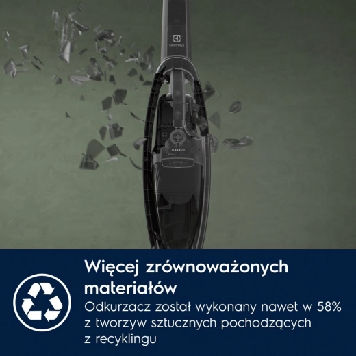 *Zawartość tworzyw z recyklingu w modelach odkurzacza akumulatorowego Electrolux 500% waha się między 64–74%.