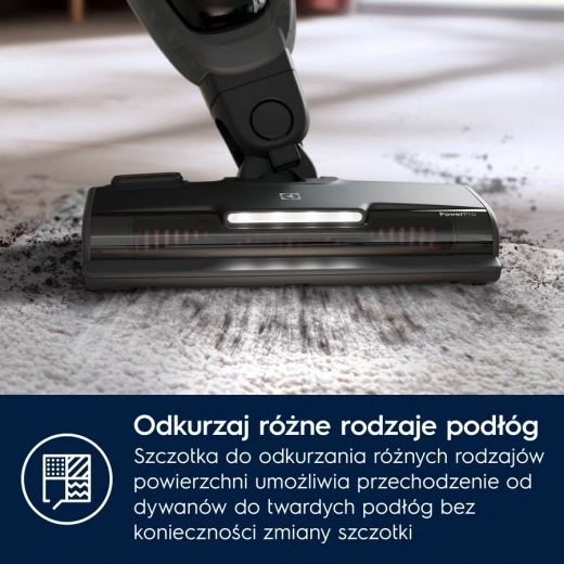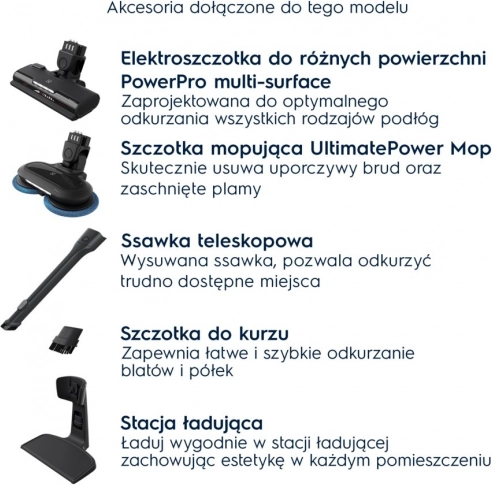 W skład odkurzacza wchodzi: elektroszczotka do dywanów i twardych podłóg z oświetleniem LED PowerPro Multifloor, szczotka mopująca PowerPro Mop, teleskopowa końcówka szczelinowa, szczotka do kurzu, stacja ładująca. Łatwy dostęp do jednostki ręcznej i dołączonych akcesoriów umożliwia dokładne i szybkie odkurzanie różnych powierzchni – od podłóg po trudno dostępne zakamarki.