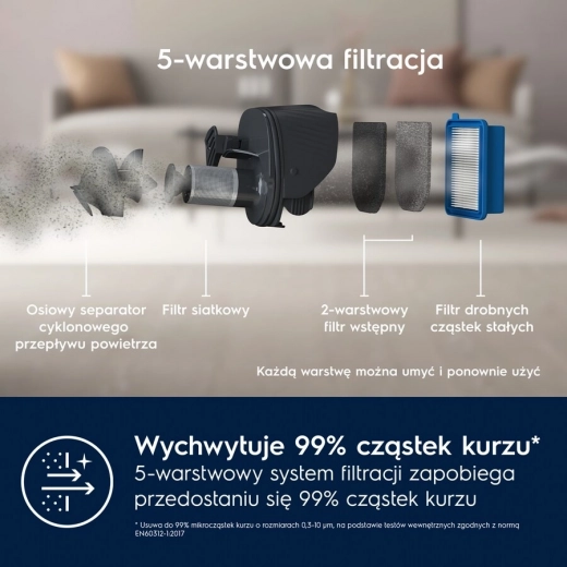 *Usuwa do 99% mikrocząsteczek kurzu o wielkości 0,3–10 µm na podstawie wewnętrznych testów zgodnie z normą EN60312-1:2017.