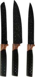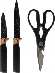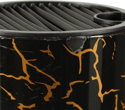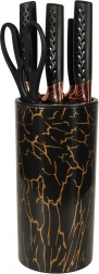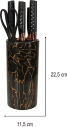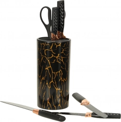Odkryj wyjątkowy design z czarnymi i miedzianymi akcentami, które poprawiają wygląd Twojej kuchni. Marmurowy stojak zapewnia praktyczne i estetyczne rozwiązanie do przechowywania, które utrzymuje noże w porządku i łatwo dostępne.