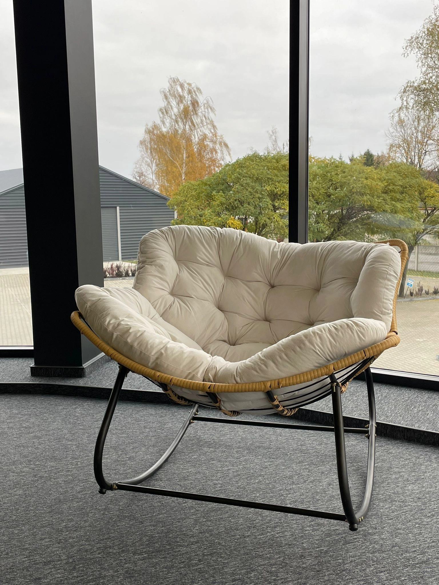 Wzbogać swoje wnętrze naturalnym stylem i komfortem dzięki temu eleganckiemu beżowemu fotelowi bujanemu z rattanu. Ten fotel jest idealny do relaksu i wyposażony w miękką, beżową poduszkę, która zapewnia wyjątkową wygodę. Dzięki solidnej metalowej ramie i wytrzymałemu rattanowi stanowi praktyczny i estetyczny dodatek do każdej przestrzeni.