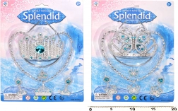 Zachwyć małą elegantkę magicznym zestawem biżuterii dla księżniczek. Opakowanie zawiera koronę, naszyjnik, pierścionek i kolczyki w kolorze różowym lub fioletowym. Idealny jako dodatek do kostiumu karnawałowego lub do zabawy w księżniczkę. Do wyboru motywy motyle lub korony.