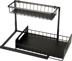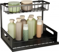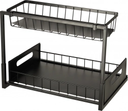 Zoptymalizuj przestrzeń pod zlewem dzięki dwupoziomowemu metalowemu organizerowi, który zapewnia sprytne i przejrzyste przechowywanie środków czystości, butelek i drobnych akcesoriów. Dzięki wysuwanemu dolnemu koszowi łatwo sięgniesz także po rzeczy umieszczone z tyłu, bez zbędnego przekładania.
