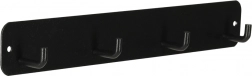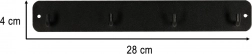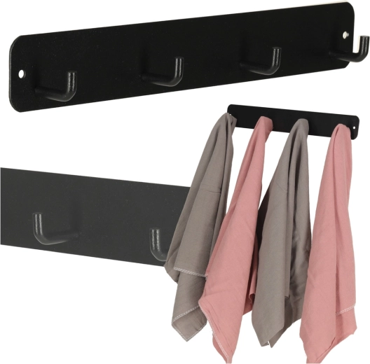 Praktyczny ścienny wieszak w czarnym kolorze oferuje cztery solidne haczyki do codziennego użytku w łazience, przedpokoju lub kuchni. Metalowe wykonanie jest odporne na wilgoć i długo zachowuje swój wygląd. Minimalistyczna listwa oszczędza miejsce, a jednocześnie zapewnia niezawodną przestrzeń do odwieszania.
