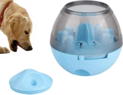 Ta sprytna piłka działa jako dozownik przysmaków i interaktywna zabawka. Zwierzę widzi i czuje przysmaki, dlatego szturcha piłkę nosem lub łapą – za ruch nagradzane jest wypadnięciem małej porcji. Wewnętrzny blokator-labirynt ogranicza ilość wypadających przysmaków i wspiera powolne karmienie, które korzystnie wpływa na trawienie i zapobiega łapczywemu jedzeniu.