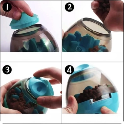 Piłkę otworzysz przez przekręcenie, wsypiesz granulki i ustawisz wielkość otworu w zależności od przysmaków oraz pożądanej trudności. Prosta obsługa i czyszczenie.