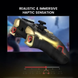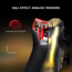 Kontroler jest autoryzowany dla XBOX i wykorzystuje technologię efektu Halla, zapewniając długą żywotność bez dryfu. Analogowe spusty o płynnym skoku dokładnie rejestrują głębokość wciśnięcia – idealne do wyścigów i gier akcji. Cztery silniki wibracyjne (w uchwytach i spustach) oferują realistyczną haptyczną informację zwrotną.
