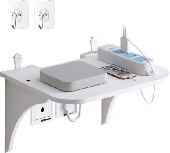 Kompaktowa półka ścienna na router Wi‑Fi i inne akcesoria. Niezwykle wygodne i oszczędzające miejsce rozwiązanie. Solidny montaż za pomocą metalowych haków z wbijanymi zaczepami. Dedykowany otwór w górnej części ułatwia podłączenie kabli sieciowych. Możliwość alternatywnego montażu za pomocą dwóch samoprzylepnych haczyków!
