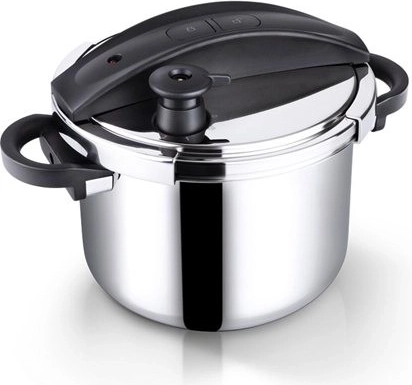 Pokrywę otwiera się naciśnięciem przycisków jedną ręką, co sprawia, że praca w kuchni jest szybka i komfortowa. Wbudowany manometr oraz wielostopniowe zawory bezpieczeństwa zapewniają spokój podczas gotowania, a kanapkowe dno równomiernie rozprowadza ciepło na wszystkich rodzajach kuchenek, w tym na płytach indukcyjnych.