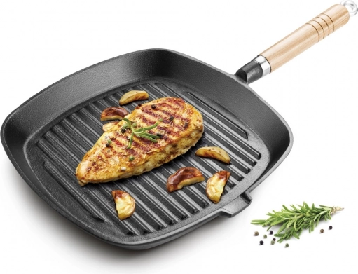 Żeliwna patelnia grillowa idealnie nadaje się do przygotowania soczystych steków, warzyw i ryb. Wysokiej jakości żeliwo zapewnia doskonałą akumulację i równomierne przewodzenie ciepła, dzięki czemu składniki smażą się równomiernie i pozostają soczyste. Wewnętrzne ryflowane dno tworzy charakterystyczne paski grillowe i umożliwia gotowanie z minimalną ilością oleju.
