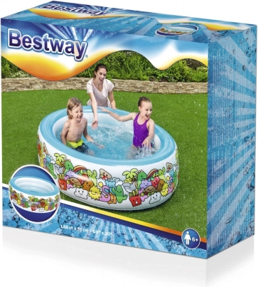 Dmuchany basen dla dzieci Bestway z kolorowymi motywami i łatwą obsługą do letnich, wesołych zabaw.