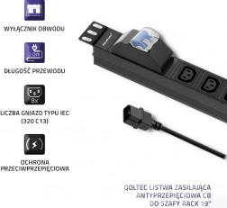 Listwa posiada 8 gniazd typu IEC 320 C13 oraz wyłącznik nadprądowy dla bezpieczeństwa podłączonych urządzeń.