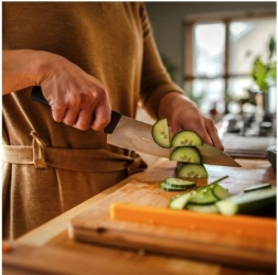 Ergonomiczna rękojeść z wykończeniem SoftGrip zapewnia pewny chwyt, a duża osłona na palce zwiększa komfort i bezpieczeństwo. Nóż jest łatwy w czyszczeniu i nadaje się do zmywarki. Idealny wybór dla nowoczesnych kucharzy poszukujących jakości i wszechstronności.