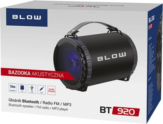 Ciesz się mocnym i czystym dźwiękiem w dowolnym miejscu dzięki przenośnemu głośnikowi BLOW Bazooka BT920. Oferuje moc 120 W, bezprzewodowe połączenie Bluetooth, wejścia USB, microSD i AUX, radio FM, a także wejście na mikrofon do zabawy w karaoke. Solidna konstrukcja, praktyczne ucho do przenoszenia i długi czas pracy na baterii czynią go idealnym wyborem do ogrodu, na plażę i do wnętrz.