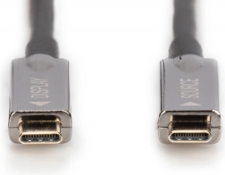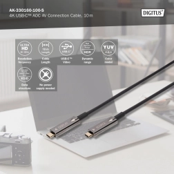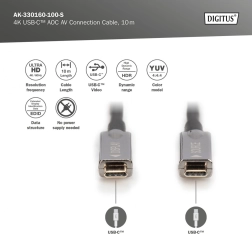 Aktywny hybrydowy kabel USB‑C–USB‑C do transmisji nieskompresowanego obrazu i dźwięku w rozdzielczości UHD 4K @ 60 Hz z przepustowością do 21,6 Gbit/s. Dzięki optyczno‑miedzianej konstrukcji jest lekki, elastyczny i odporny na EMI, idealny do dłuższych odcinków (10 m). Wspiera DisplayPort 1.2 oraz USB‑C DP Alt Mode, działa w trybie plug and play bez zewnętrznego zasilania.