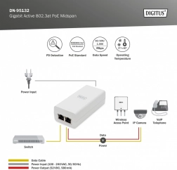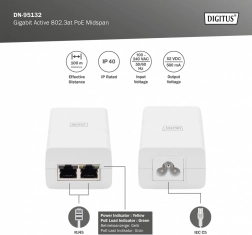 Aktywny midspanowy injektor PoE do użytku wewnętrznego łączy dane i zasilanie w jednym kablu Ethernet, znacząco upraszczając instalację urządzeń sieciowych. Wspiera IEEE 802.3at (PoE+) z wsteczną kompatybilnością z IEEE 802.3af, zapewnia wyjście 52 V DC / 0,58 A (do 30 W) i pracuje z prędkościami 10/100/1000 Mb/s. Dwa porty RJ45 (LAN i PoE) umożliwiają bezproblemowe zasilanie i transmisję danych na odległość do 100 metrów po kablu Cat5e/Cat6.