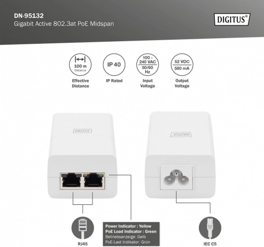 Injektor PoE+ 802.3at 30 W, gigabit 10/100/1000, biały – DIGITUS