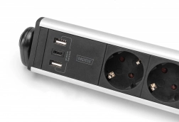 W zestawie znajdują się dwa solidne zaciski do szybkiego montażu na blacie o grubości 20–57 mm bez wiercenia. Po przymocowaniu listwę można obracać poziomo o 180°, aby ustawić idealny dostęp do gniazd i portów USB. Dla bezpiecznej pracy jest tu podświetlany główny wyłącznik oraz zabezpieczenia przed dziećmi w uziemionych gniazdach.