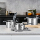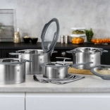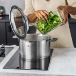 Odkryj nowoczesny zestaw naczyń ZWILLING Simplify ze stali nierdzewnej 18/10 z inteligentnymi detalami dla wygodnego gotowania. Szklane pokrywki z silikonową krawędzią i zintegrowanym sitkiem umożliwiają łatwe odlewanie bez durszlaka, uchwyty z miękkim w dotyku silikonem pozostają chłodne, a wielowarstwowe dno SIGMA Classic+ zapewnia równomierne rozprowadzanie ciepła. Zestaw nadaje się na wszystkie typy kuchenek, w tym indukcję, do piekarnika do 180 °C i jest przyjazny dla zmywarki.